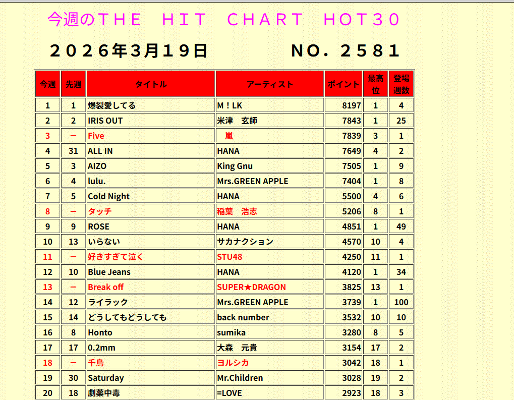 まずは、嵐、5年4か月振りの新曲「Five」いきなりの3位初登場。